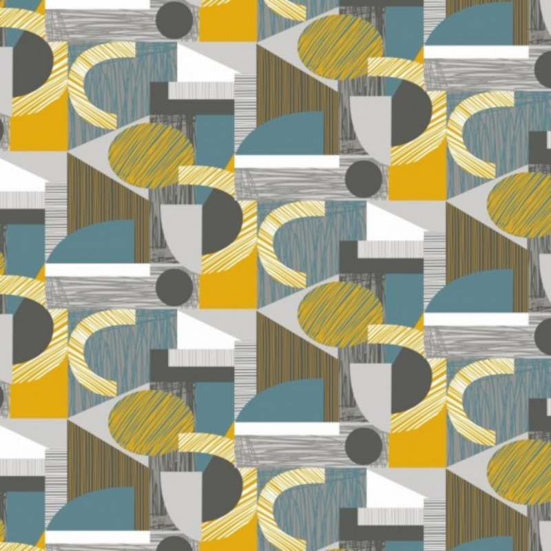 Abstract Multi is a stylish fabric from Nutex’s Fields of Gold collection. This 100% cotton fabric showcases an abstract mid-century modern design with overlapping geometric shapes—circles, semicircles, squares, and rectangles—in earthy muted tones of grey, yellow, teal, and brown.