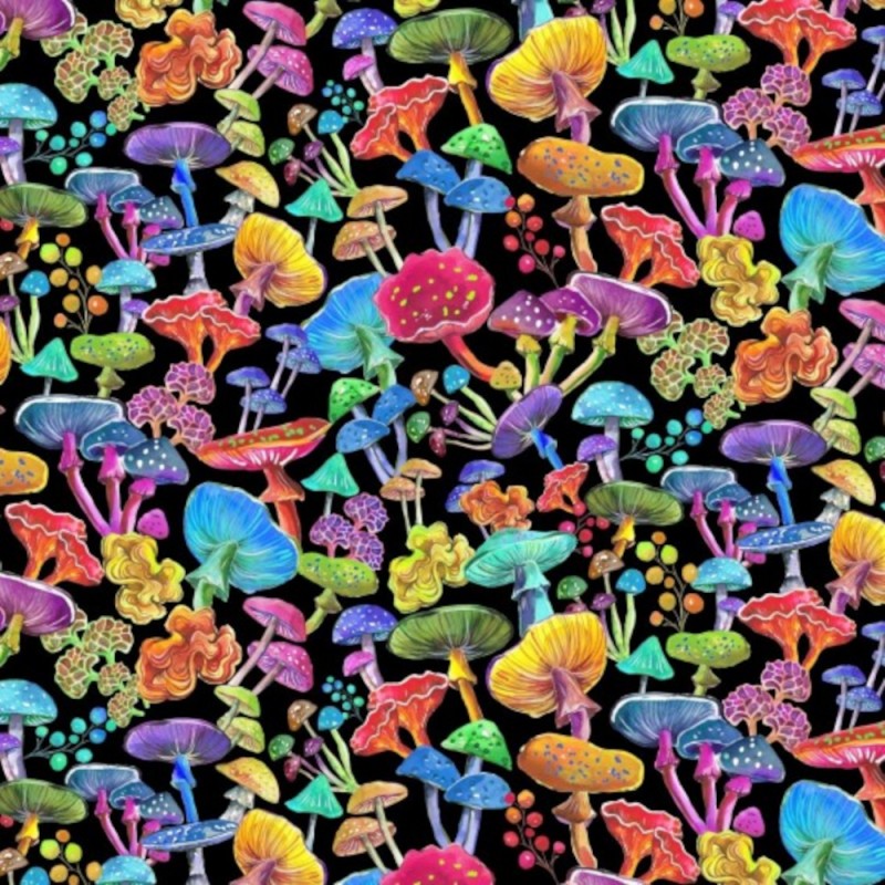 Mushrooms Black is part of the Luminous collection from Nutex. This striking fabric features a lively design of multicoloured mushrooms, all set against a crisp black background. The vibrant colours and playful details make it a stand-out choice for sewing and craft projects.