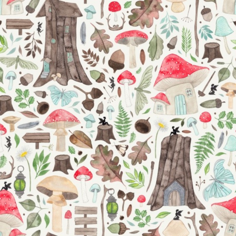 Fairytale Mushroom Houses from the Fairytale collection by Nutex showcases charming, storybook-style illustrations of toadstool houses, trees, mushrooms, acorns, and whimsical fairies on a soft light background. The magical woodland design is perfect for quilting, crafting, home décor, and accessory projects, bringing a playful, imaginative touch to any creation.