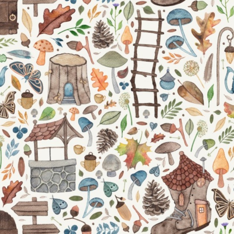Boots & Ladders from the Fairytale collection by Nutex captures the magic of classic storybooks with its delightful illustrations of shoe-houses, ladders, mushrooms, acorns, leaves, and butterflies. The playful woodland theme evokes the charm of traditional fairy tales, making it a perfect choice for quilting, crafting, décor, and imaginative sewing projects.