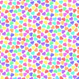 Hearts from the Princess Dreams collection by Nutex features a lively, tossed print of multicoloured hearts available in two colourways: a rich navy background or a clean white background. The scattered heart motifs create a cheerful, playful look, ideal for projects that need a touch of fun and colour.