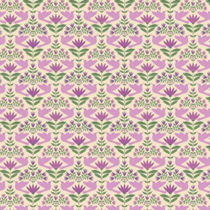 Flying Free is part of the Bohemian Blooms range from Nutex. This symmetrical, repeating design features stylised purple and green flowers alongside pairs of facing birds. Vertical columns alternate between tall floral motifs and bird motifs, accented with leaf sprigs and small flower clusters, creating a dense, decorative pattern that adds charm and interest to any project.