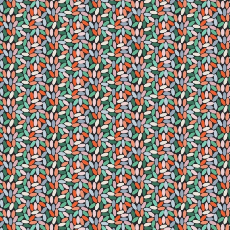 Sprinkles is part of the Bohemian Blooms range from Nutex. This lively design features a densely packed, repeating pattern of small oval shapes arranged in clusters on a dark background. The shapes appear in a variety of vibrant colours, including green, orange, pink, and blue, creating a playful and energetic design perfect for adding a pop of colour to your sewing projects.