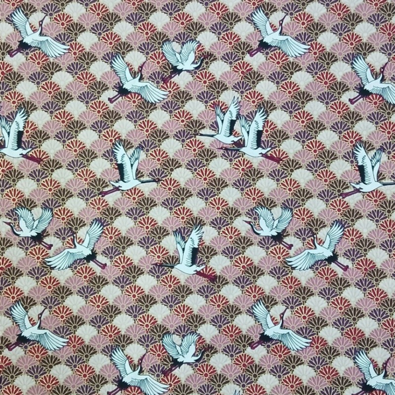 Tedori by Nutex is a sophisticated Japanese-inspired print combining the grace of cranes in mid-flight with stylised floral motifs outlined in metallic gold. The intricate design captures movement and tranquillity, evoking traditional Japanese artistry and textile heritage.