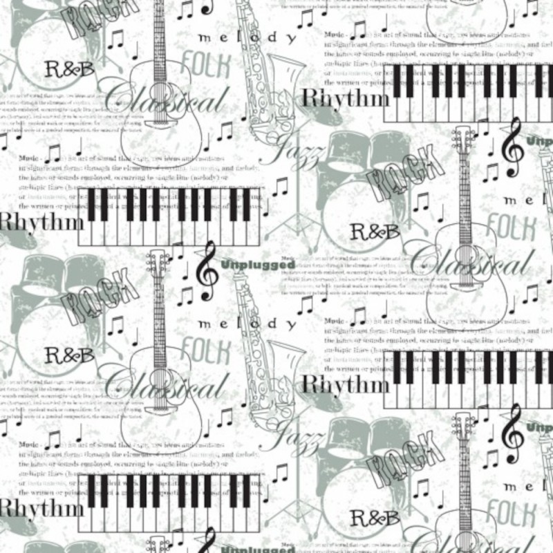 Musical notes, treble clefs and text referencing styles such as Rock, Jazz, Folk, R&B and Classical are scattered throughout the design. The layout is evenly spread across the fabric, making it suitable for use across larger projects as well as smaller pieces. Printed on 100% cotton, this fabric is suitable for quilting, patchwork and general sewing projects, particularly music-themed makes.
