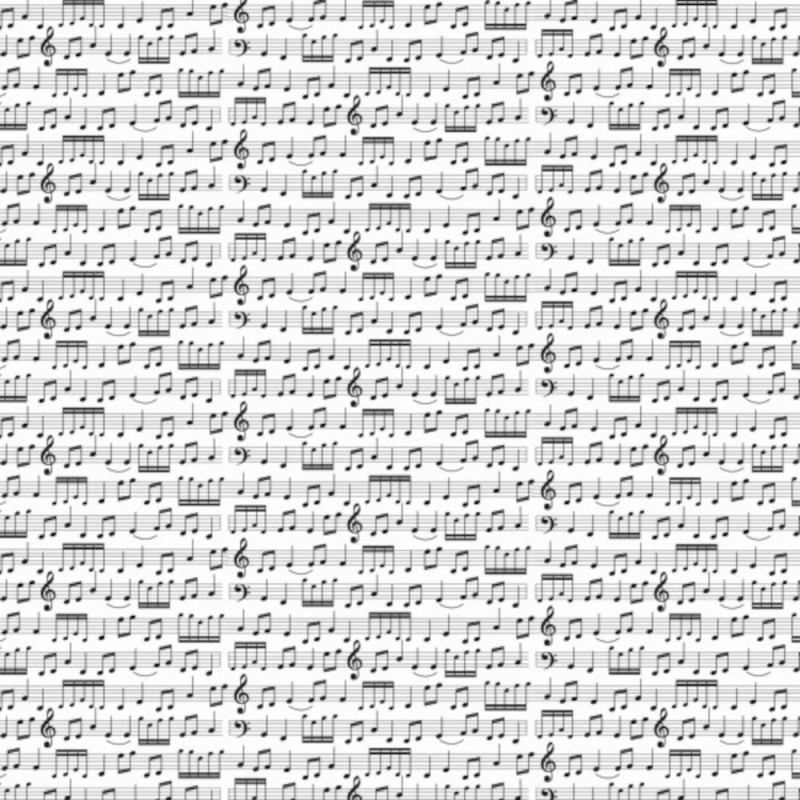 The Music Sheet White design from the Music range by Nutex features a repeating musical notation print on a white background. The pattern includes black staves, treble clefs and a variety of musical notes, arranged densely and evenly across the fabric for a consistent all-over design.