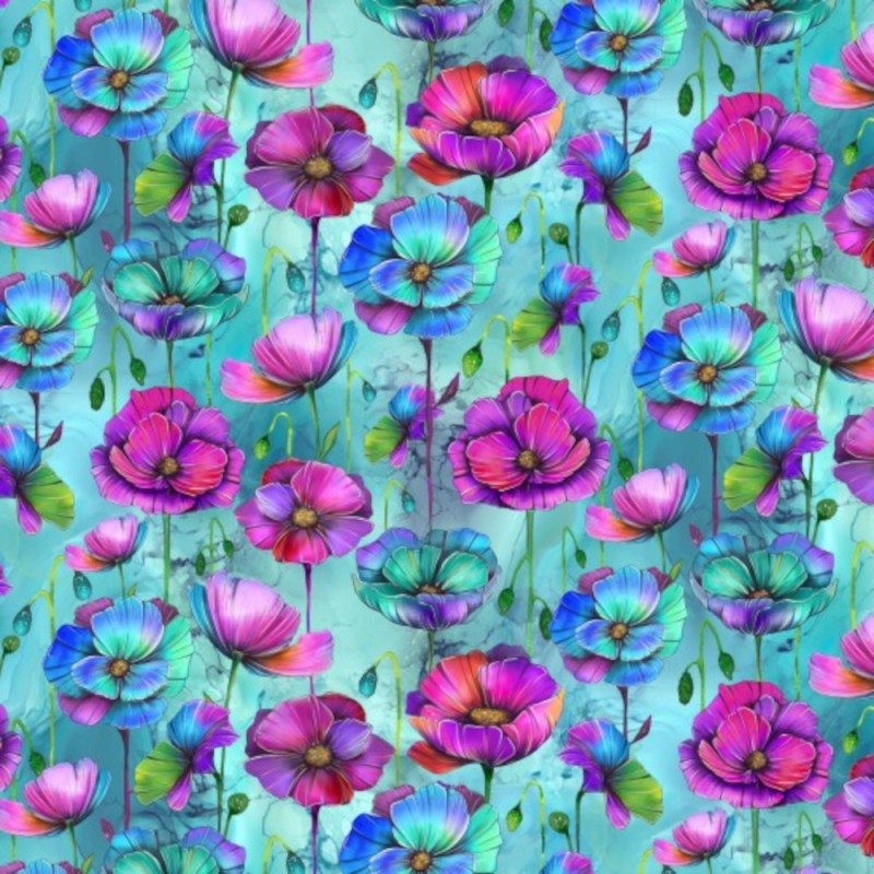 This 100% cotton fabric from Nutex is part of the Dragonflies range and features the Floral Aqua design. The print is filled with bright, cheerful flowers in shades of pink, purple, blue and green, each with long, delicate green stems. The light aqua background has subtle swirls and patterns, adding extra visual interest.