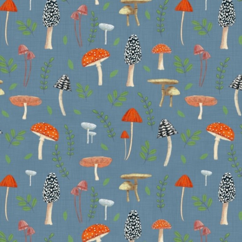 Mushrooms Denim from the Whimsical Fields collection by Nutex features a charming scattered print of illustrated mushrooms in a mix of shapes and colours, set against a soft denim blue background. The design combines playful toadstools with small leafy sprigs, giving it a relaxed woodland feel without being overly busy.
