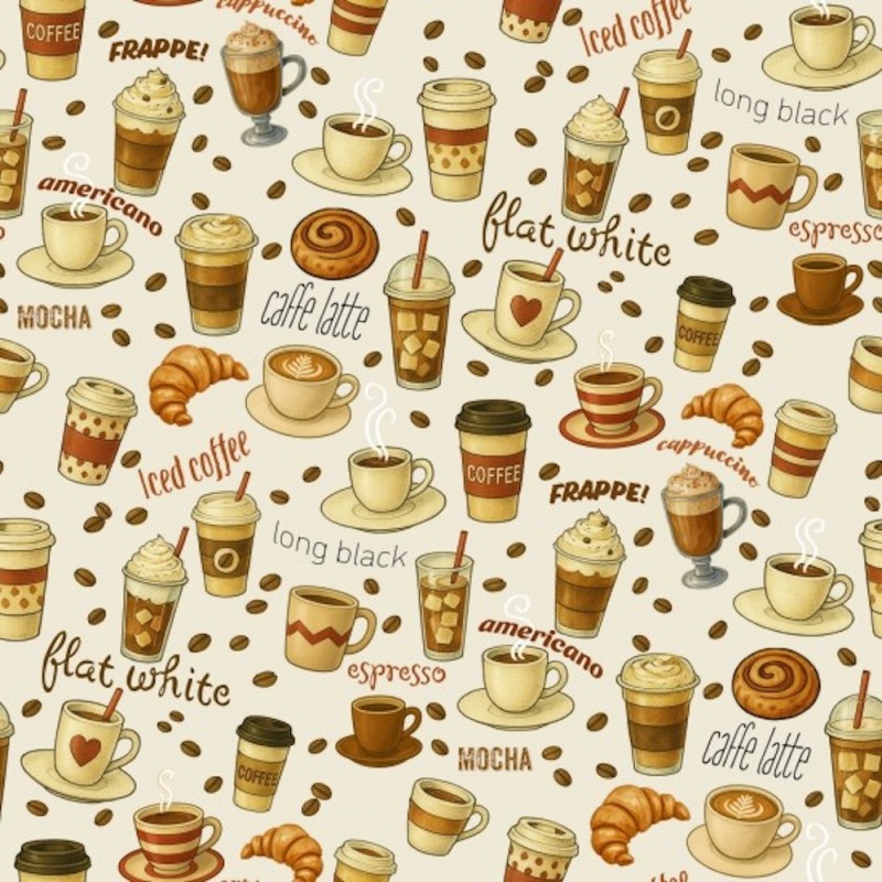 Add a light and cheerful touch to your sewing projects with this Nutex “Caffeinated” coffee-themed fabric in a soft cream colourway. Featuring a delightful mix of coffee styles such as espresso, latte, cappuccino and flat white, alongside coffee cups, beans and pastries, this design is perfect for any coffee enthusiast.