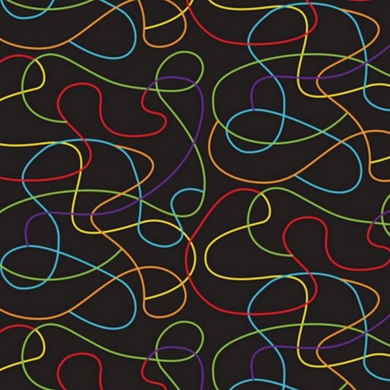 Add a playful and modern touch to your projects with this “Wild & Bright” abstract lines cotton fabric from Nutex. Featuring a lively pattern of colourful looping lines in red, yellow, blue, green and purple across a black background, this design brings energy and movement to any creation.