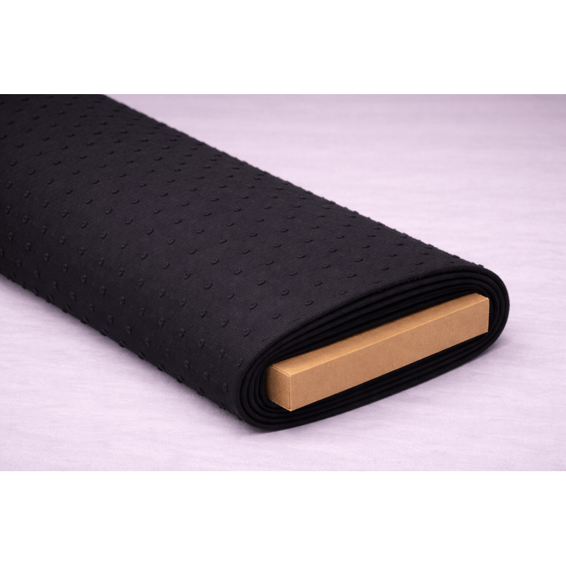 - Design: Swiss dot / dobby spot pattern