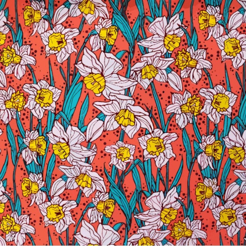 Mindy Polycotton Daffodils Falcon View – Cheerful daffodil print in Blue, Red, or Yellow. Lightweight and ideal for crafts, dressmaking & spring décor.