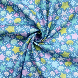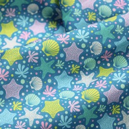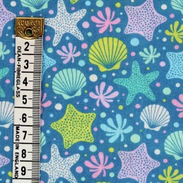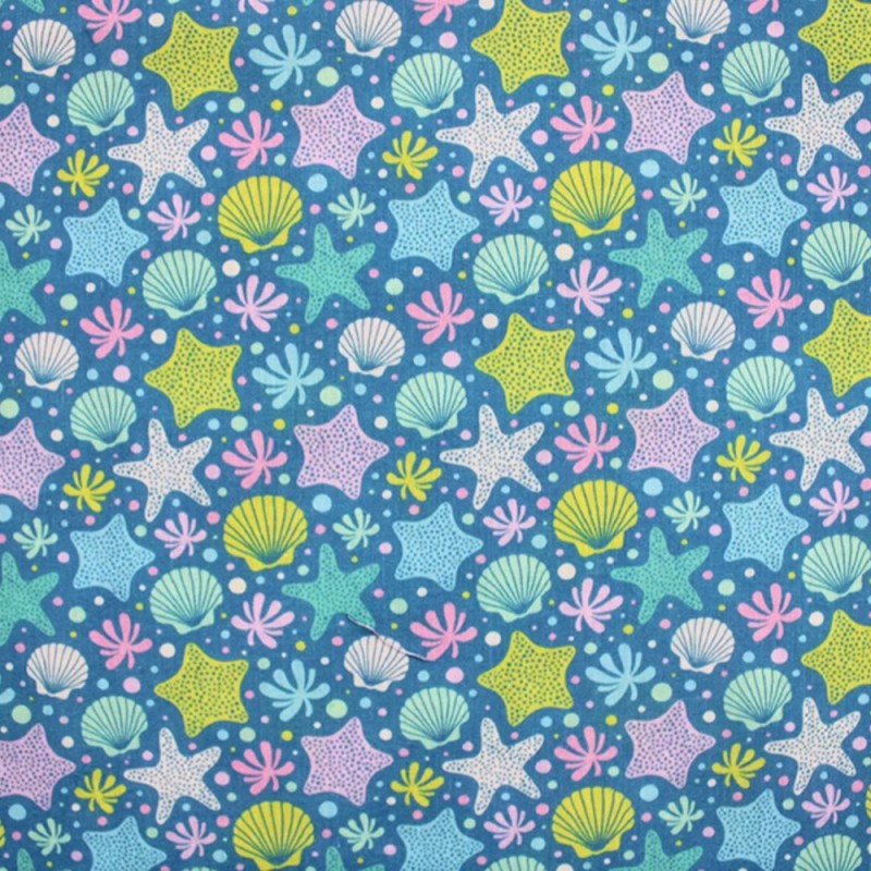 Dive into a sea of creativity with Starfish, a vibrant digital design from the MP Digital Polycotton range. This charming ocean-themed print features starfish, sea shells, and polka dots in cheerful shades of green, blue, and pink, all set against a rich blue background.