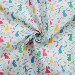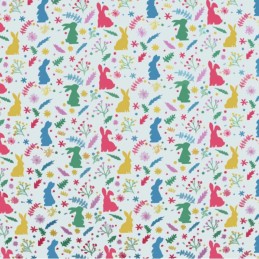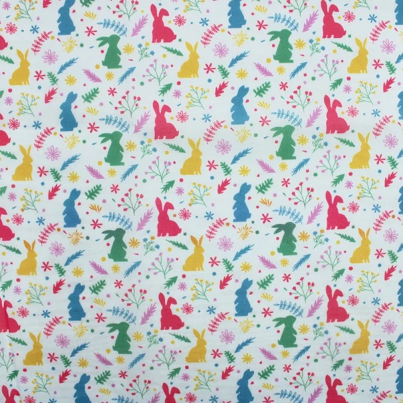 Celebrate the charm of springtime and woodland whimsy with Bunnies, a delightful addition to the MP Digital Polycotton collection. This cheerful design features multicolour bunny silhouettes paired with floral elements, all scattered across a crisp white background.
