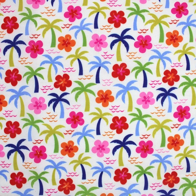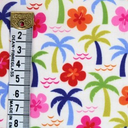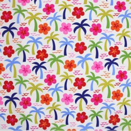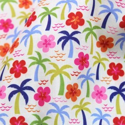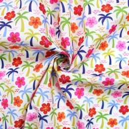 Bring a burst of tropical sunshine to your makes with the Palms fabric from the MP Digital Polycotton collection. This lively print features a mix of multicoloured palm trees, wave designs, and tropical flowers, all set against a soft cream background for a breezy beachside vibe.