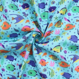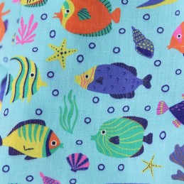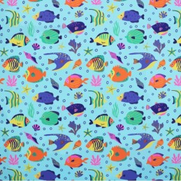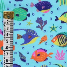 Bring the magic of the ocean to your makes with the Tropical Fish fabric from the MP Digital Polycotton range. This fun and vibrant print features a lively underwater world filled with colourful tropical fish, sea shells, starfish, seaweed, coral, and bubbles, all set against a beautiful blue background.