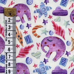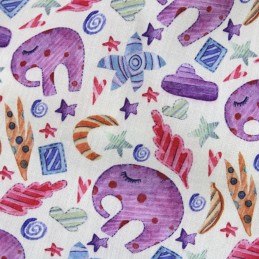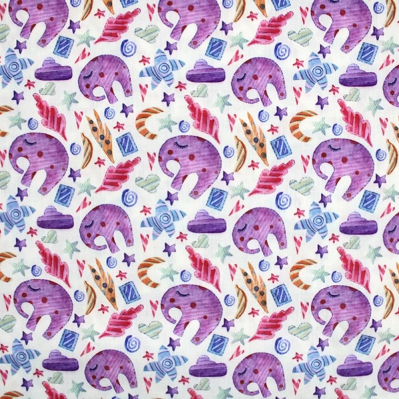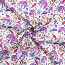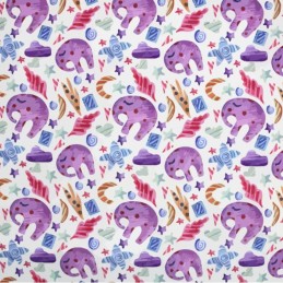 Add a pop of playful colour to your creations with the Elephants design from the MP Digital Polycotton range. This cheerful print features simplistic purple cartoon elephants surrounded by stars, hearts, crescent moons, swirls, and other abstract shapes in lively shades of pink, orange, blue, and green – all on a soft cream background.