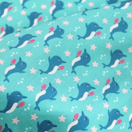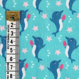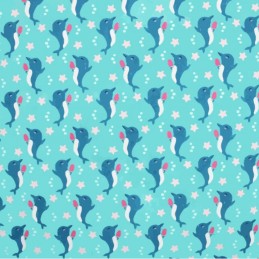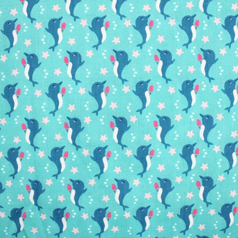 Bring a splash of summer fun to your next project with the Dolphins print from the MP Digital Polycotton collection. This cheerful design features smiley cartoon dolphins enjoying ice lollies, surrounded by playful star and bubble motifs, all set against a cool blue background.