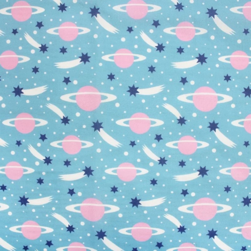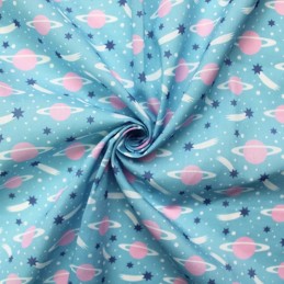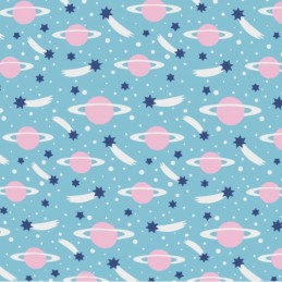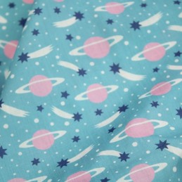 Launch your next sewing project into orbit with the playful Planets design from the MP Digital Polycotton range. This whimsical space-themed fabric features pink planets with white Saturn-like rings, dark blue shooting stars with trailing tails, and scattered white polka dots, all set on a cosmic blue background.