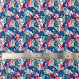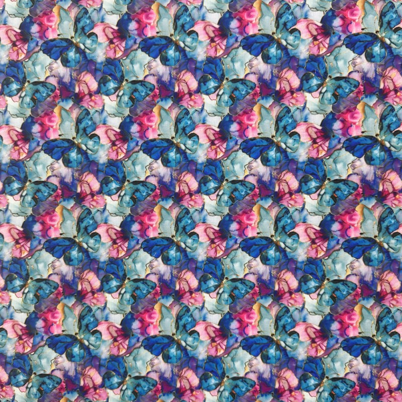 The Marble Batik Butterflies fabric from the Crafty Polycotton Digital Printed range showcases butterflies rendered in a marbled batik-inspired style, digitally printed to give a layered, textured appearance. The flowing, natural colours and artistic butterfly motifs create a unique and creative fabric, perfect for quilting, craft projects, home décor, and accessories.