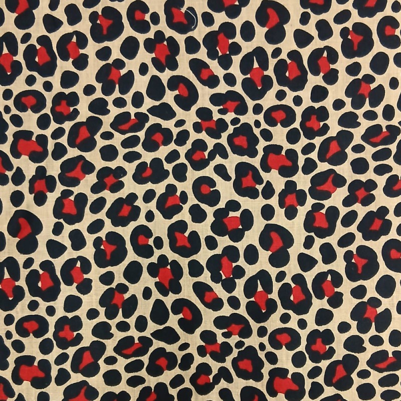 This leopard print polycotton fabric features a bold, repeating animal print design with black spots and rich red detailing set against a warm tan background. It’s a classic leopard look that works just as well for statement pieces as it does for smaller accents.