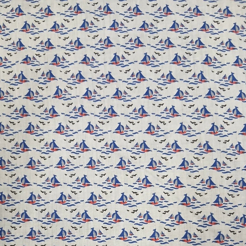 This SALE white polycotton fabric features a charming, simple print of red and blue sailboats sailing across blue and white waves. The playful nautical design has a crisp, clean look, perfect for lightweight projects with a fresh, summery feel.