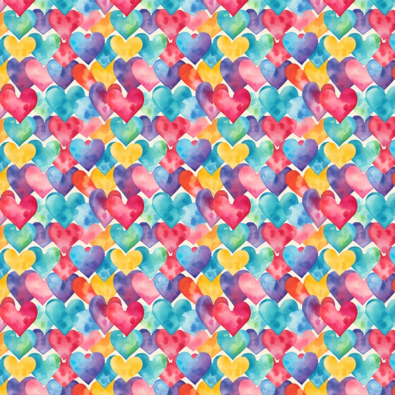Watercolour Hearts Polycotton Fabric features a vibrant all-over repeat of overlapping watercolour hearts in a rich mix of bright and pastel colours. The layered heart pattern creates a lively, expressive design that’s perfect for statement sewing projects.