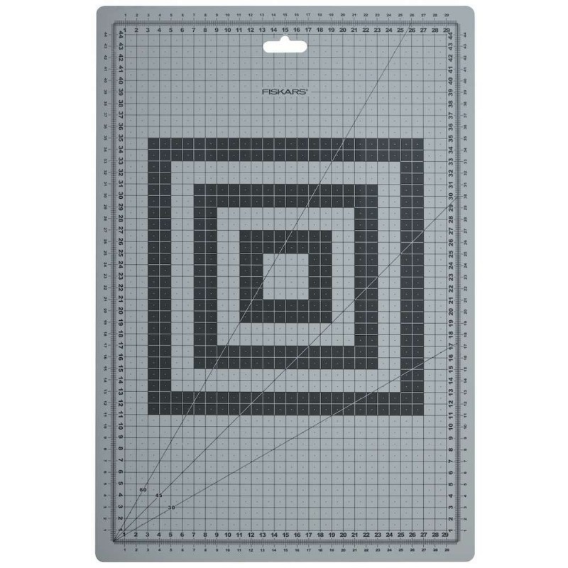 Protect your surfaces and improve your crafting precision with the Fiskars Cutting Mat. This high-quality, long-lasting self-healing mat is ideal for a wide range of projects. Featuring a reversible design with easy-to-read markings in both metric and imperial units, it’s perfect for cutting fabrics, papers, and more. The 30°, 45°, and 60° angle guides make creating intricate shapes like triangles and stars effortless. A built-in hanging hole offers convenient storage.