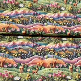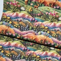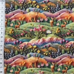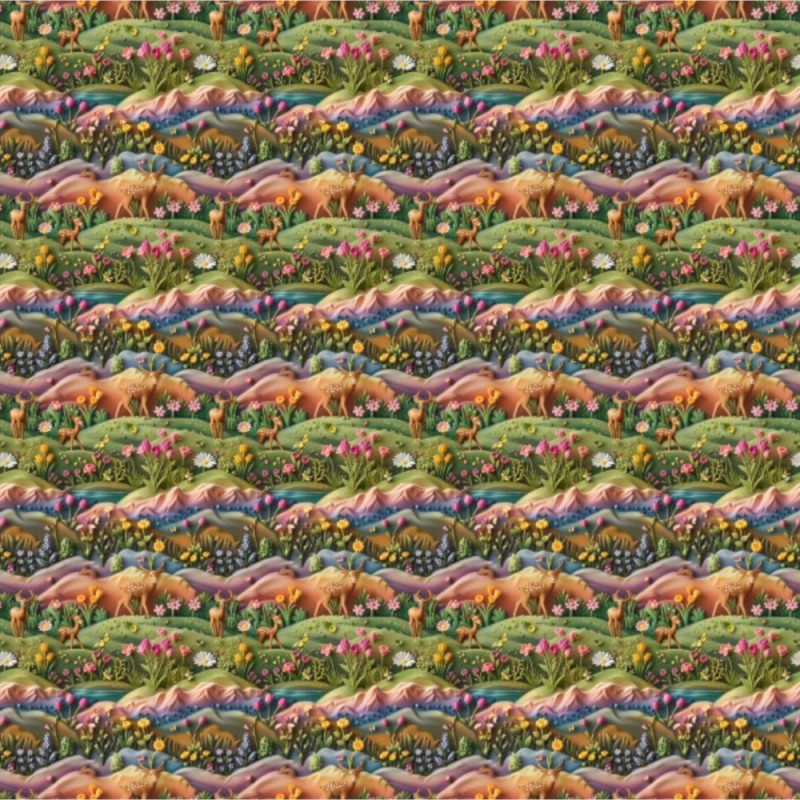 Create something magical with Little Johnny’s Digital Cotton 3D Deer Scene. This beautifully illustrated print captures a layered, hilly landscape filled with elegant deer and scattered flowers. The overlapping mountain-like peaks and nature-inspired elements create a sense of depth and serenity, all brought to life through a high-quality 3D digital print.