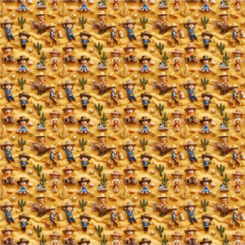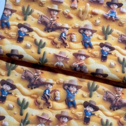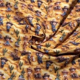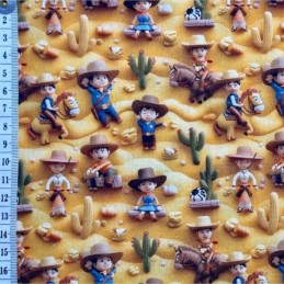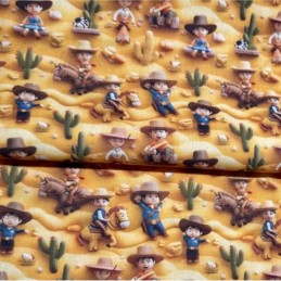 Bring a touch of the Wild West to your next project with Little Johnny’s Digital Cotton 3D Cowboy. This lively print features a sun-drenched, yellow hilly landscape dotted with classic Western elements—cowboys in action, galloping horses, and scattered cacti. The digital printing creates a subtle 3D-style effect, giving the design added depth and dimension.