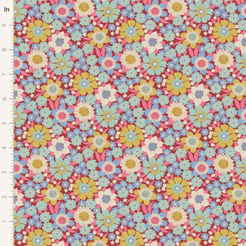 The Wallflower collection by Tilda is an ornamental fabric range inspired by the romantic design styles popular in the 1960s and 1970s. This collection offers two distinctive color stories to suit different tastes: one fresh and sweet with vintage reds, greens, and pinks accented by hints of blue and sour yellow, and the other with deeper caramel, blue, ginger, ochre, and thistle tones evoking a nostalgic nod to the ‘60s and ‘70s. The premium 100% cotton fabric features a high thread count and meets OEKO-TEX® Standard 100 Class 1 certification for safety and quality.
