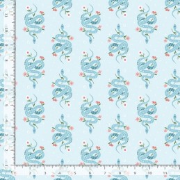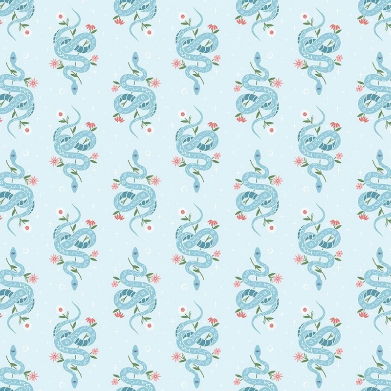 The Dear Stella Don’t Hiss Me Off fabric is a striking 100% cotton digital print featuring a playful, illustrated blue snake entwined with delicate flowers, set against a misty blue background adorned with subtle celestial details. The whimsical design perfectly captures Dear Stella’s signature style – modern, fun, and full of personality.