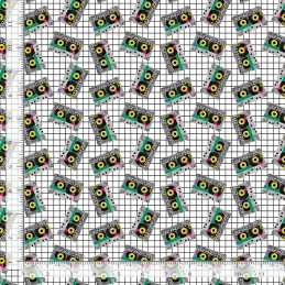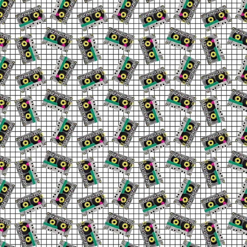 The Dear Stella B-Sides fabric, designed by Pammie Jane, is part of the vibrant Mix Tape collection. This retro-inspired print features colourful cassette tapes set against a white background with a black grid overlay, evoking a nostalgic 80s and 90s feel with a modern twist.