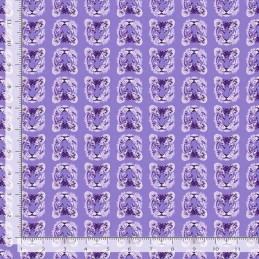 The Dear Stella El Tigre fabric, designed by Pammie Jane, is part of the edgy Mix Tape collection. This bold digital print features rows of intricately detailed purple tiger heads set against a vibrant violet background, making it a true statement fabric with modern flair.
