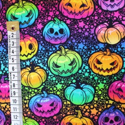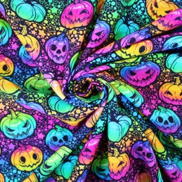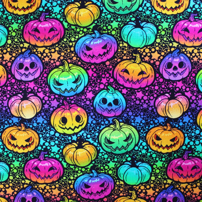 (REMNANT) 100% Cotton Digital Fabric Little Johnny Neon Pumpkin Rainbow Halloween Spooky