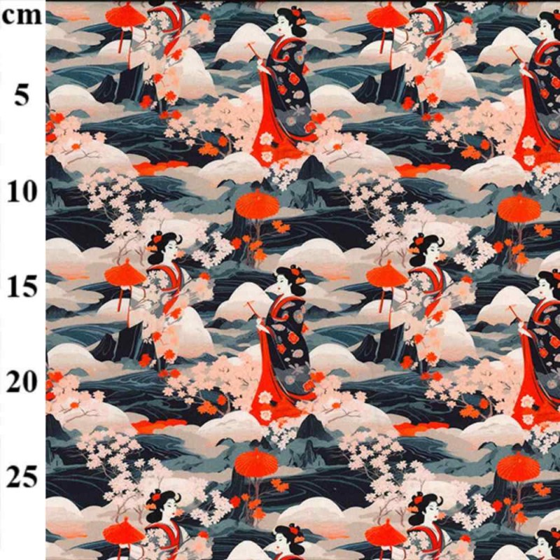 Rose & Hubble Japanese Geisha Print Cotton Poplin Fabric – 112cm Wide – Traditional Japanese Design