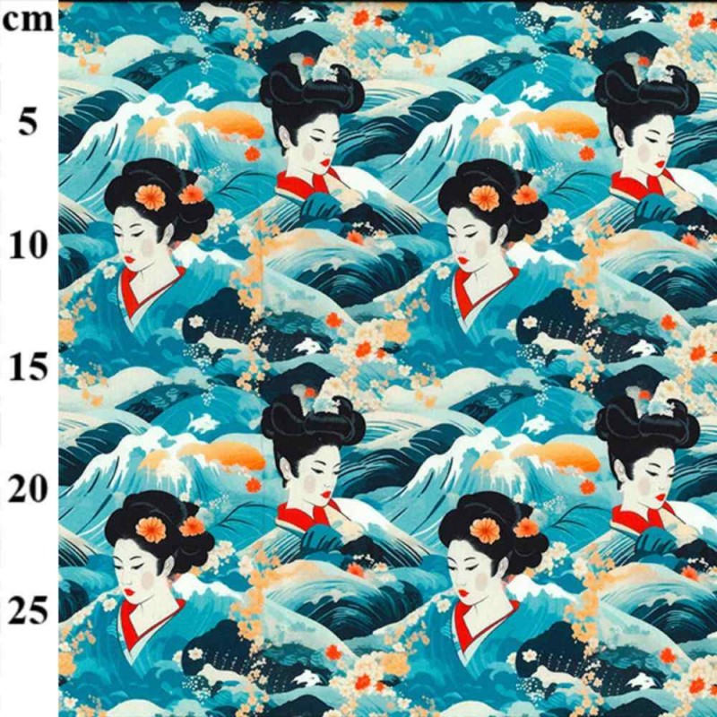 Rose & Hubble Japanese Geisha Print Cotton Poplin Fabric – Blue Waves Design – 112cm Wide