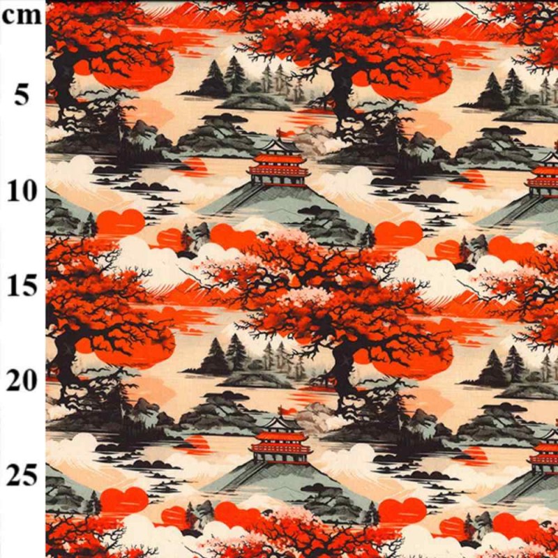 Beautiful Japanese pagoda and cherry blossom print in red, black, cream, and grey