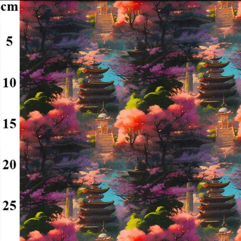 Scenic print featuring Japanese pagodas and blossom trees in purple, pink, green, and turquoise