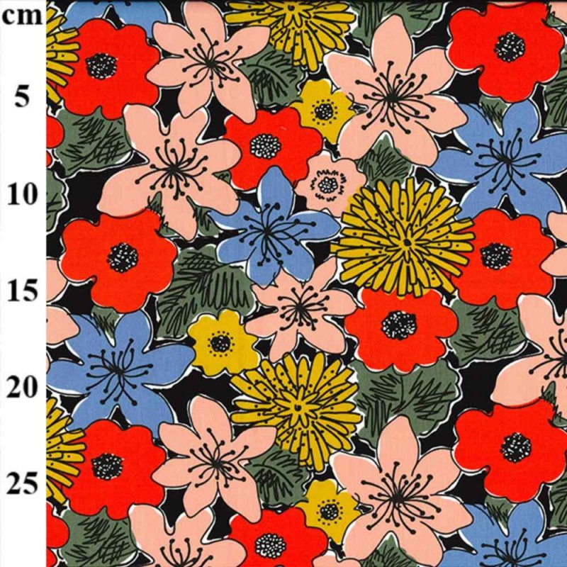 Pattern: Bold floral motifs with detailed black outlines