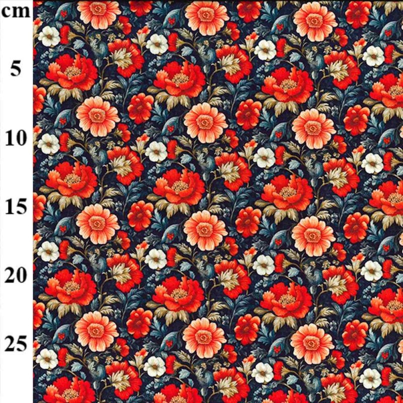 Capture timeless elegance with this Rose & Hubble 100% cotton poplin fabric featuring a vintage floral design. Bold red, peach, and cream flowers with lush green and blue foliage contrast beautifully against a deep dark background, creating a rich and sophisticated look. This smooth, lightweight 130gsm cotton poplin fabric is perfect for a wide range of sewing and craft projects, from garments to quilts and home décor accents. Certified to Oeko-Tex Standard 100, it ensures safe and environmentally friendly use. Add a touch of classic beauty to your next creative project with this striking floral fabric.
