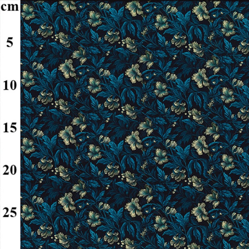 Embrace the timeless beauty of the Arts and Crafts movement with this William Morris-inspired fabric. Featuring a rich botanical pattern of flowing blue-green leaves and delicate cream flowers set against a deep, dark background, this premium 100% cotton fabric perfectly blends vintage elegance with practical durability. Its classic design is ideal for quilting, apparel, and home décor projects, bringing a touch of Morris’s iconic style to your creative work. Whether crafting cushions, curtains, clothing, or quilts, this fabric offers a beautiful, sophisticated aesthetic alongside the comfort and breathability of cotton.