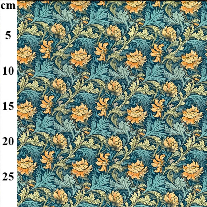This exquisite Rose & Hubble cotton fabric features a classic William Morris-inspired design with intricate acanthus leaves and delicate yellow blooms set against a rich teal background. Evoking the timeless beauty of the Arts and Crafts movement, this botanical print is perfect for quilting, dressmaking, upholstery, and home décor projects. Crafted from premium 100% cotton and certified to Oeko-Tex Standard 100, it offers durability and a smooth finish, making it an ideal choice for creative makers seeking vintage charm and versatility.