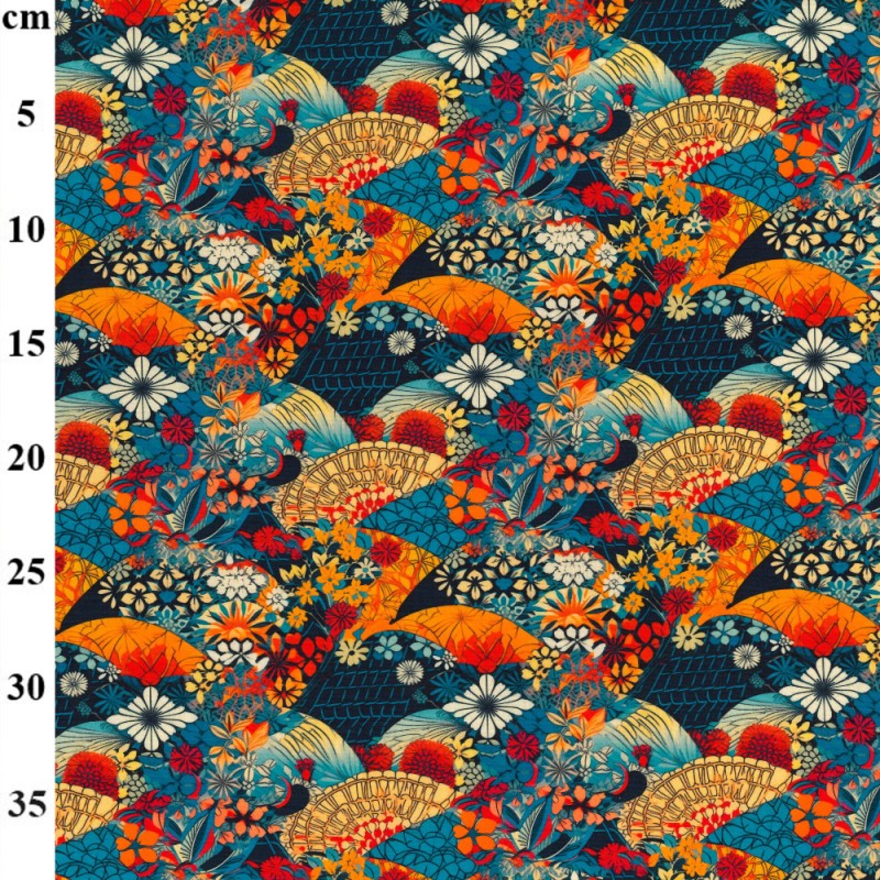 John Street from Rose & Hubble is a vibrant, ornamental print combining stylised fans, flowers, and foliage in shades of blue, orange, and yellow on a rich dark blue background. The lively pattern brings energy and elegance to any sewing project.