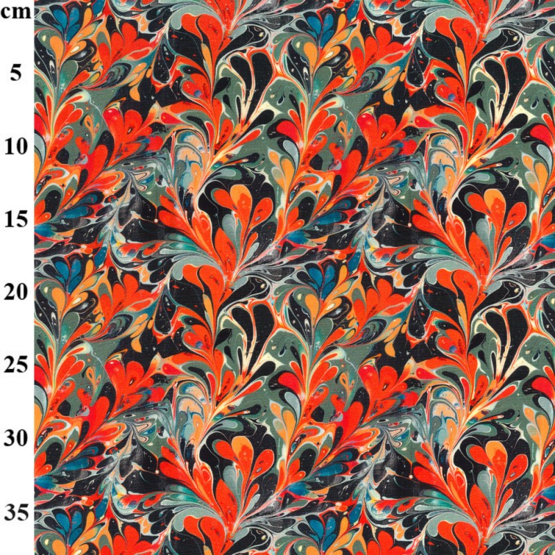 Swirling abstract design in red, orange, black, blue, and green