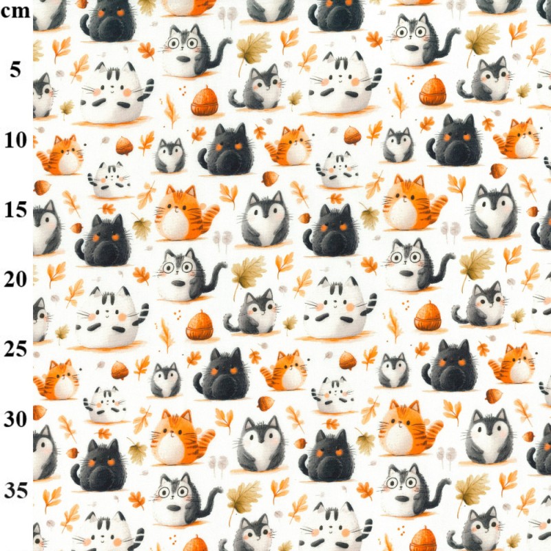 Gage Court from Rose & Hubble features a charming repeating design of cartoon cats with autumn leaves and acorns on a crisp white background. The whimsical pattern is ideal for projects that need a fun, seasonal touch.