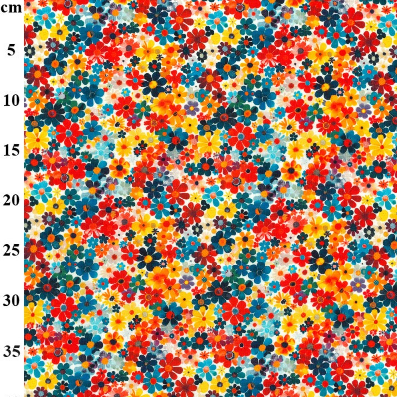 • Dense floral print in red, blue, yellow, and orange