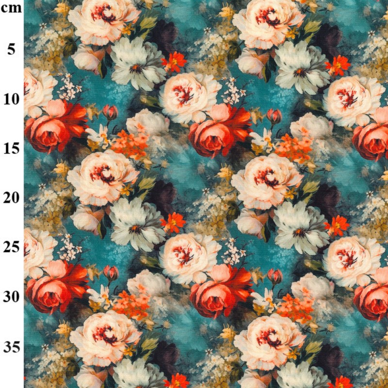 Redwing Grove from Rose & Hubble showcases a classic floral design featuring roses and other flowers in warm shades of red, white, and orange. Set against a teal background with a soft, watercolour-style finish, the design has a gentle, painterly feel that works well for both traditional and contemporary projects.