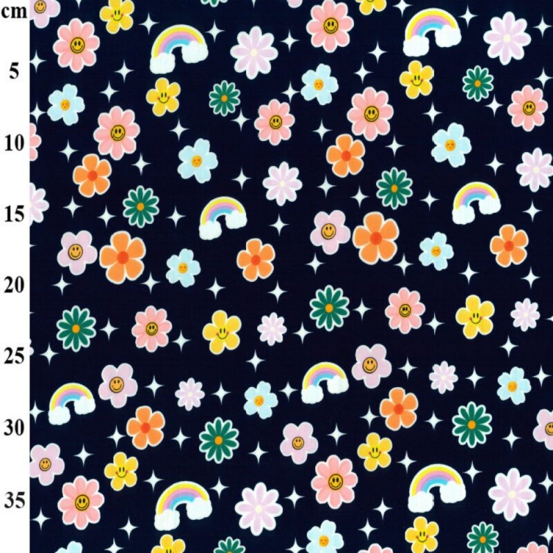 A joyful and playful design set against a deep blue background, filled with bright flowers, smiling flower faces, rainbows, and scattered star shapes. The flowers vary in size and style, with pink blooms featuring cheerful smiley centres, alongside orange, green, yellow, and soft blue flowers that add depth and variety to the pattern.