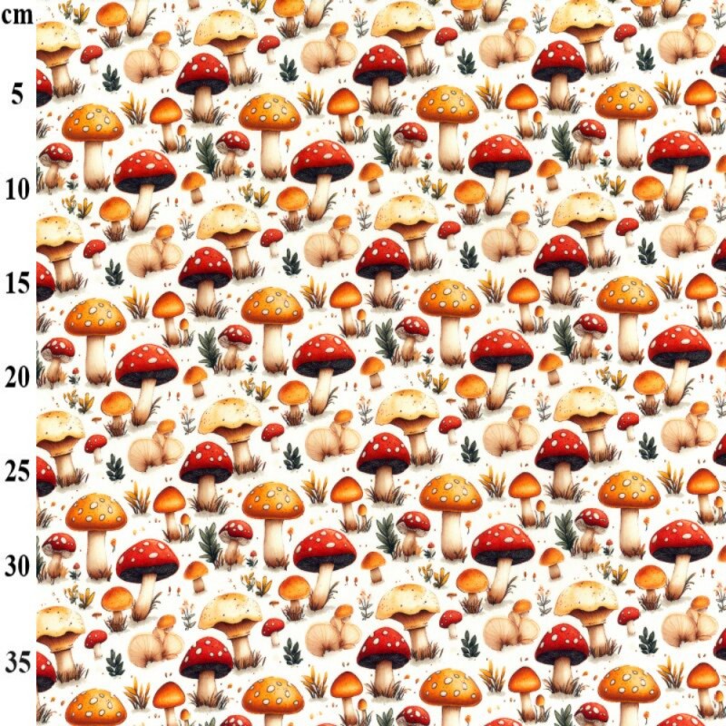 A charming design featuring various mushrooms in red, orange, and tan, scattered across a crisp white background. The mushrooms vary in size and shape, some speckled with white dots, with stems in shades of white and light brown. Smaller mushrooms, green sprigs, and blades of grass add texture and a natural woodland feel to the composition.